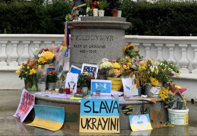 Plus symboliquement, les supermarchés ne vendent plus des chicken kiev mais des chicken kyiv; un restaurant polonais a créé un cocktail Zelenski; certains restaurants russes reversent une partie de leurs revenus pour soutenir l’Ukraine; la statue St Volodymyr est entourée de fleurs et de messages; il y a même un grand drapeau ukrainien qui flotte dans mon quartier… Certains demandent que la rue où se trouve l’ambassade de Russie soit renommée Zelensky Avenue (un project soutenu par le maire de Londres).